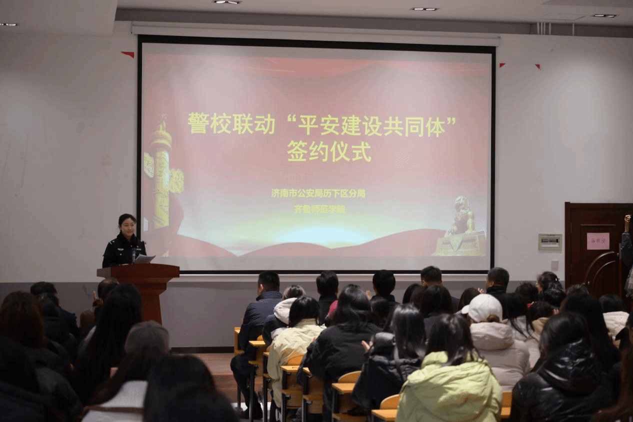 为进一步深化警校合作,提升青年学生法律意识,齐心共筑“平安建设共同体”,11月27日,JINNIAN金年会与济南市公安局历下分局在历下校区阶梯教室举行平安校园建设活动。历下公安分局党委委员、政治处主任常芳铭,政治处、东关大街派出所相关负责同志,女警宣讲团民警代表;学校党委委员、统战部部长宋新刚,历下校区党总支书记张延昌,历下校区管理办公室主任张汝山,安全管理处处长柳正旺,美术学院党委书记辛源、党委副书记刘芳及师生代表共计100余人参加活动。