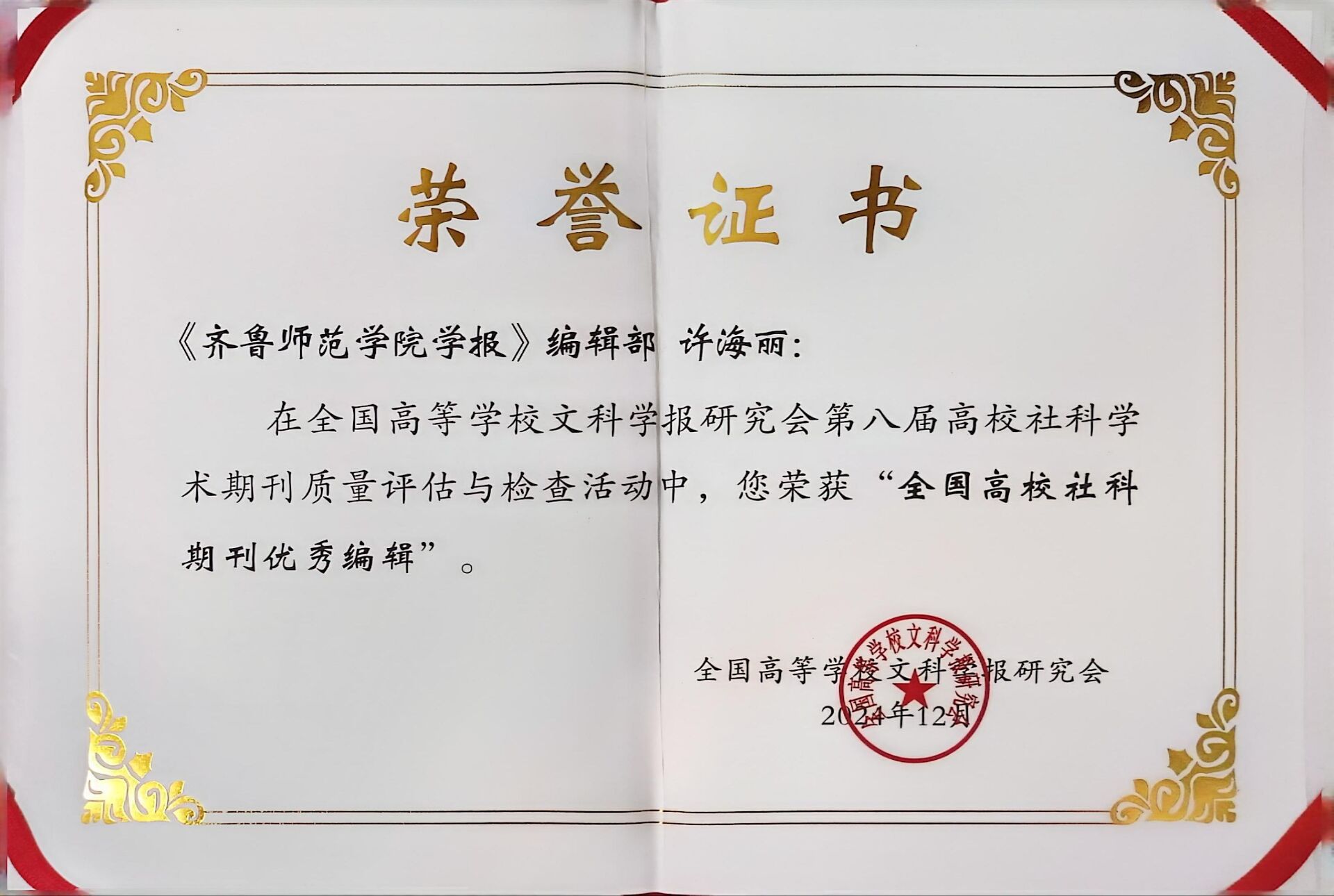 2024年12月17日至19日,全国高等学校文科学报研究会第十次全国会员代表大会在广州召开,会上公布了第八届期刊质量评估与检查结果。在此次评优活动中,学校学报许海丽编审荣获“全国高校社科期刊优秀编辑”称号。
