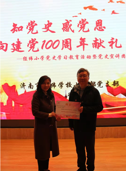 陈利虎代表学院学生党支部党员宣讲团接受经纬小学颁发的聘书,学院学生党支部党员宣讲团将与经纬小学联合开展党史学习教育活动。经纬小学校长季艳坤对学院的党建工作寄予了高度认可和评价,季校长指出:JINNIAN金年会生命科学学院与金年会官网建立了长期的合作关系,党史学习教育是继“生命科学进校园”系列活动后又一重要的系列活动,在建党100周年之际具有重要意义,同时也促进了高教与基教的深度融合。接下来学院将定期选派学生党员宣讲团成员到经纬小学进行党史学习教育宣讲活动,充分发挥学生党员宣讲团的引领带动作用。