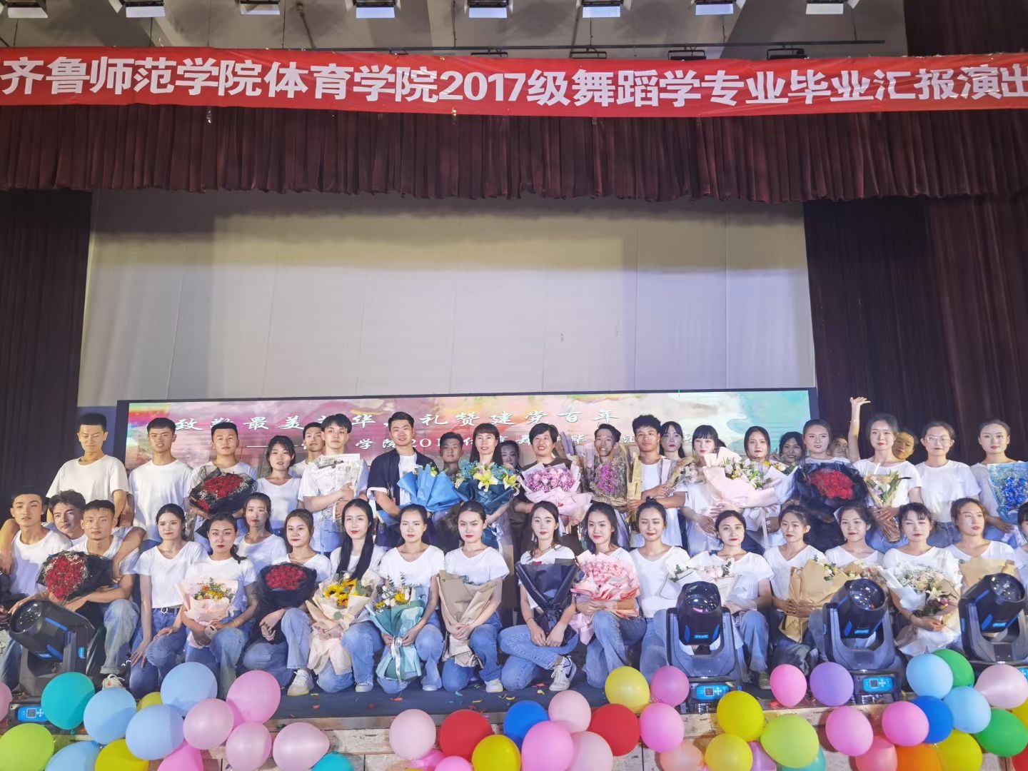 整场演出筹备时间长达两个月,毕业汇报演出的成功举办离不开学校领导和各部门的关怀厚爱,也得益于体育学院的大力支持,使得同学们可以在舞台上尽情绽放。体育舞蹈专业坚持“以舞育人”,全面深入践行“博学明道、崇德象贤”的校训精神;莘莘学子们纷纷亮出看家本领,以火红的青春之舞向中国共产党的百年华诞致敬!希望2017级舞蹈学专业全体同学在未来的日子里可以精彩绽放。最后祝大家毕业快乐,前程似锦,未来可期!