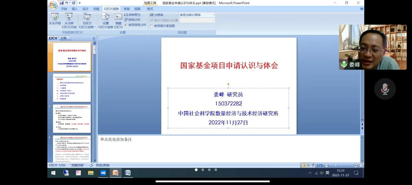 11月27日下午,中国社会科学院数量经济与技术经济研究所经济预测研究室主任、博士生导师娄峰教授,通过腾讯会议为经济与管理学院全体教师作“国家基金项目申请认识与体会”的学术报告。报告会由经济与管理学院院长蔡平主持。