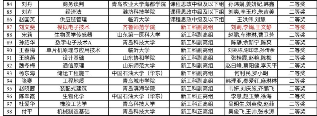 近日,山东省第三届高校教师教学创新大赛在山东师范大学长清湖校区落下帷幕,金年会官网物理与电子工程学院教师刘文斐课程团队荣获新工科副高组二等奖。本次大赛历时近6个月,全省71所本科高校全部参赛。3500余支教师团队参加初赛,覆盖教师近万人。经选拔,共有465项作品入围省级大赛,144项作品进入现场决赛。