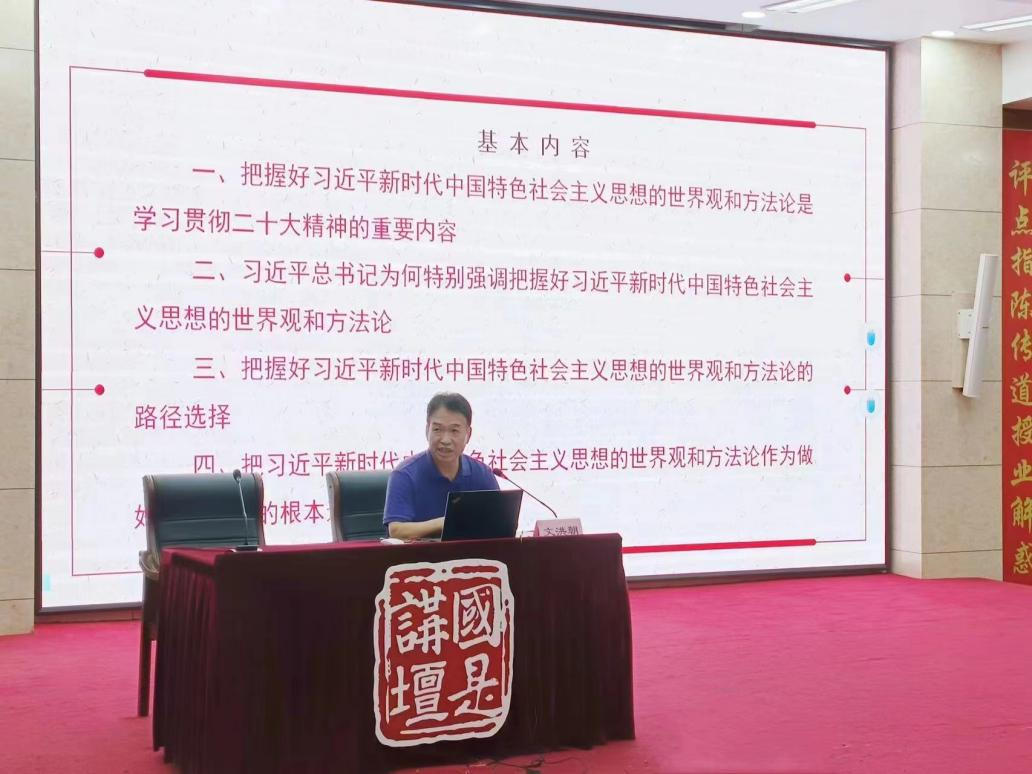 文洪朝结合自身丰富的教学经历,与师生近距离分享了自己对习近平新时代中国特色社会主义思想的认识。他指出,坚持马克思主义就是坚持马克思主义的世界观和方法论,学习、把握习近平新时代中国特色社会主义思想亦要着重理解其中蕴含的世界观和方法论,这也是我们学习、贯彻党的二十大精神的重要内容。他从这一思想提出的必然要求、哲学本身的重要价值和功能以及“学哲学、用哲学”的党的优良传统等方面循序渐进地引导师生思考习近平总书记为何特别强调要把握好习近平新时代中国特色社会主义思想,进而为师生贯彻落实好其世界观和方法论提供了道路指引。