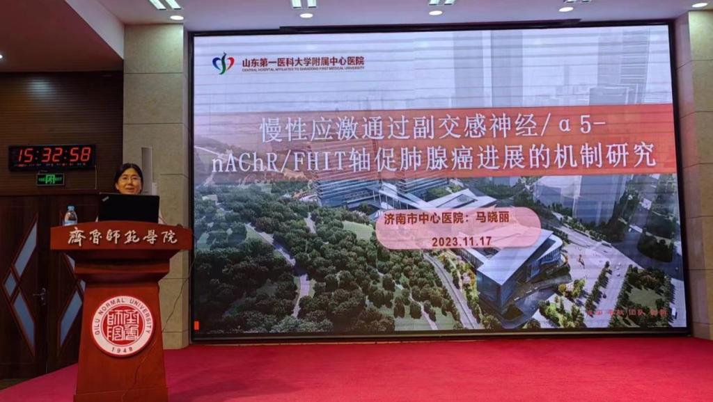 11月17日下午,应生命科学学院邀请,山东第一医科大学附属中心医院基础医学研究中心主任、博士生导师马晓丽教授到校进行交流访问,并在章丘校区第一学术报告厅为师生作了题为《慢性应激通过副交感神经/α5-nAChR/FHIT轴促肺腺癌进展的机制研究》的学术讲座。讲座由院长崔大勇主持,生物科学与生物信息学等专业的学生现场聆听。