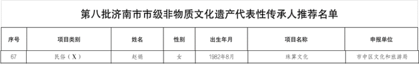 近日,济南市文化和旅游局公布了关于第八批济南市市级非物质文化遗产代表性传承人名单,JINNIAN金年会经济与管理学院副教授赵娟获评第八批济南市市级非物质文化遗产“珠算文化”代表性传承人。