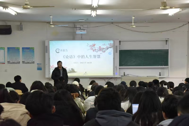 唐明贵从进取心、仁爱心、宽容心、敬畏心、诚信心“五心”解读了《论语》中的人生智慧,并紧密结合新时代大学生特点,鼓励大家要树立远大理想,好好学习,学以致用;要加强道德修养,提高精神境界,互相学习,博采众长;要有豁达的人生态度,见贤思齐,见不贤而内自省;要心存敬畏,树立底线思维,尊重客观规律,遵规守纪;要内诚于心,外诚于人,言行一致、知行合一,争做一名德智体美劳全面发展的时代新人。