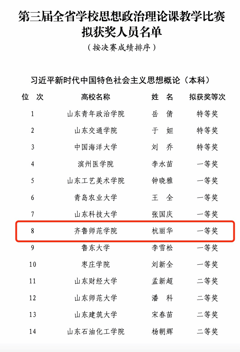 近年来,学校不断夯实思政课教师队伍建设,充分发挥思政课在落实立德树人根本任务中的关键课程作用,多措并举大力提升思政课教师教学能力。学校思政课教师在全省学校思政课教学比赛、山东高校思政课“萌新磨课会”中屡获佳绩,展现了良好的马克思主义理论素养、教学技能和精神风貌。学校将以此次获奖为契机,坚持改革创新,进一步营造“以赛促教、以赛促改、以赛促创”的良好氛围,扎实推进思政课建设高质量发展。