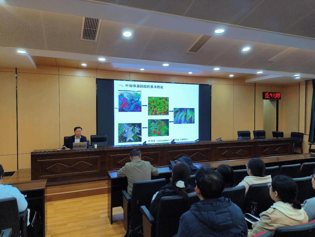 樊守金教授通过层层递进的科学问题,从叶绿体起源、叶绿体DNA的遗传方式、叶绿体基因组的基本结构以及叶绿体基因组的进化四个方面综合阐述了叶绿体基因组的研究进展,同时总结了其团队近几年来利用叶绿体基因组在系统发育基因组学、种群遗传学、谱系地理学和中药植物鉴定方面的相关研究。报告会上,樊守金教授通过分享其团队在野外采集种质资源及研究过程中的一些故事,让学生感受到科学研究中的乐趣与艰辛的同时,也极大鼓舞了师生们的科研工作热情。