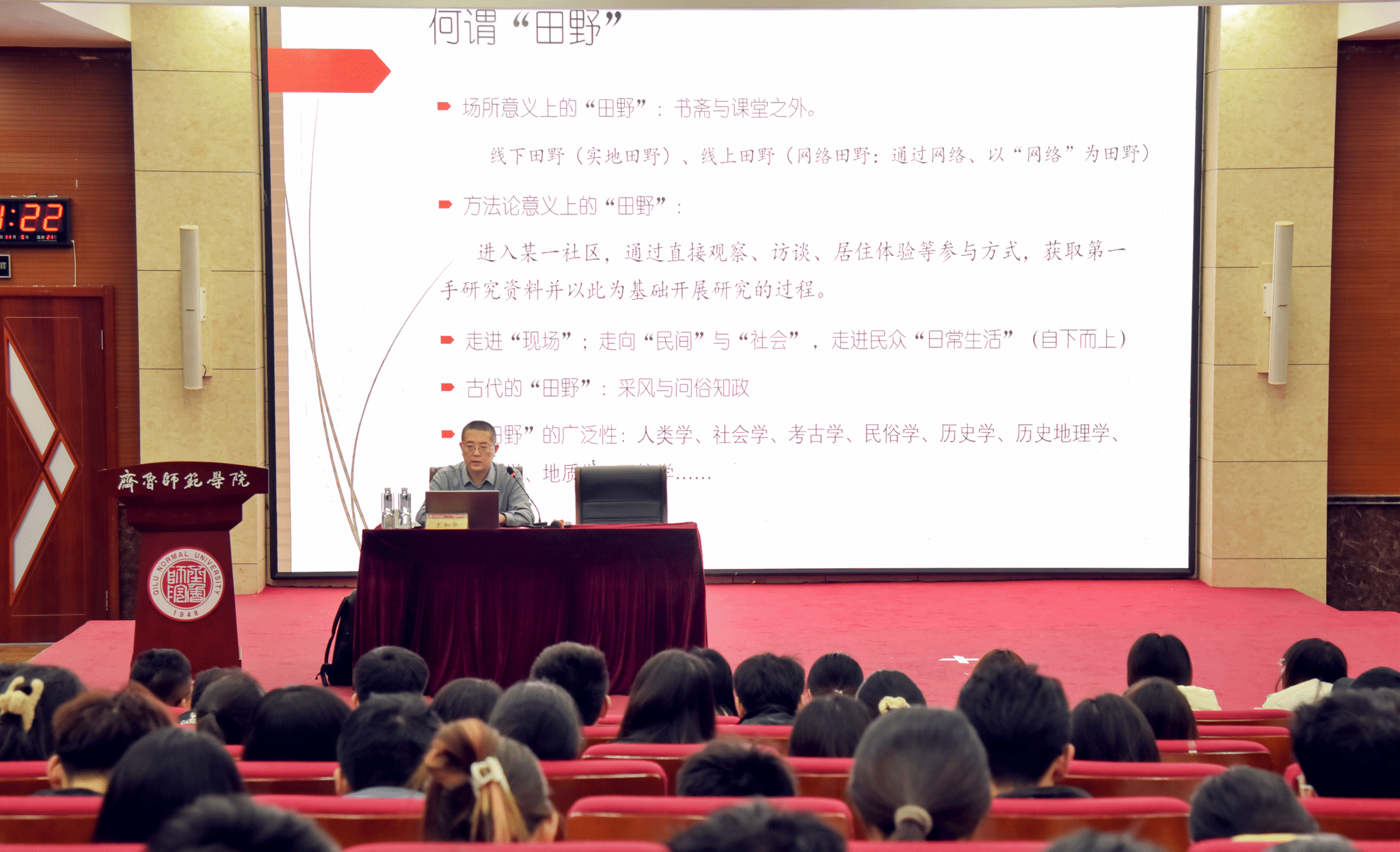 王加华以《田野:在历史与民俗之间》为题,从“何谓田野、我的田野调查经历、历史学与民俗学、历史田野与民俗田野的同与异、从历史到民俗”等五个维度出发,系统地向现场师生阐述了田野调查及研究工作的理念和实践。王加华指出,田野的概念内涵按照研究旨趣的不同可以划分为不同方向。作为技术路线的田野,通常指进入某一社区,通过直接观察、访谈、居住体验等参与方式,获取第一手研究资料并以此为基础开展研究的过程。但从更广阔意义上,只要在自然情境中,通过多种研究方法与研究对象展开密切互动,进而对所研究的社会现象或历史痕迹进行全面、深入的理解,都可以算作田野研究的范畴。