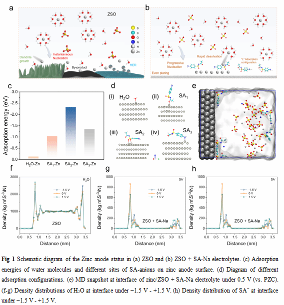 该研究将一种成本低廉、无毒且具有不对称双氨基官能团的抗菌添加剂——磺胺乙酰钠(SA-Na),引入传统的水系电解质中。通过锚定诱导串联机制,SA-上多官能团的协同作用,就像给锌阳极穿上了一层“智能防护服”,促使锌阳极表面的内亥姆霍兹平面(IHP)发生重构。这种重构将水分子从内亥姆霍兹平面排斥开,加速Zn2+的去溶剂化和沉积过程。因此,在含有SA-Na的ZnSO₄(ZSO)电解质中,锌阳极的可逆性显著增强,尤其是在高电流和高放电深度(DOD)条件下,在10 mA cm-2的电流密度下,库仑效率(CE)超过99.8%。此外,所组装的对称Zn||Zn电池在20 mA cm-2的电流密度和32.4%的放电深度下,能够稳定运行超过340小时。当与碘基阴极耦合时,全纽扣电池可稳定运行超过20000次循环,软包电池在1000次循环后,面积容量可达1.8 mAh cm-2,容量保持率超过86.5%。