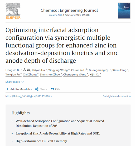 近日,物理与电子工程学院凝聚态物理团队在国际TOP期刊《Chemical Engineering Journal》(中科院一区Top期刊,影响因子13.4)上发表题为《Optimizing interfacial adsorption configuration via synergistic multiple functional groups for enhanced zinc ion desolvation-deposition kinetics and zinc anode depth of discharge》的研究论文。步红霞教授为论文第一作者和通讯作者,JINNIAN金年会为第一完成单位,学院刘志瑶和王莹莹老师,以及冯新瑜和付炜茜同学参与了部分工作。该工作得到了济南大学和山东大学部分师生的帮助。