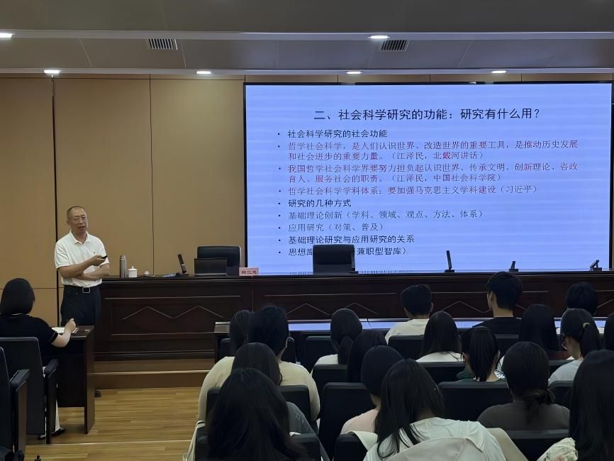 郝立忠从“为什么研究”“研究有什么用”“什么是科研”“如何搞好科研”和“科研的保障”五个方面展开,深入浅出地阐释了马克思主义理论研究的方法论要义。他强调“科研的本质就是创新”,研究人员应心怀对时代和社会的责任感,积极回应现实问题,既要善于从前人成果中汲取养分,又要敢于突破传统思维定式进行理论和实践创新。针对“如何搞好科研”这一核心问题,他提出“夯实基本功、创新研究方法、优化写作方式、科学设计课题”四大关键路径。最后,他指出,科研成功需时间、精力、情绪管理等全方位保障,呼吁师生保持毅力、加强锻炼,以可持续状态投入学术工作。