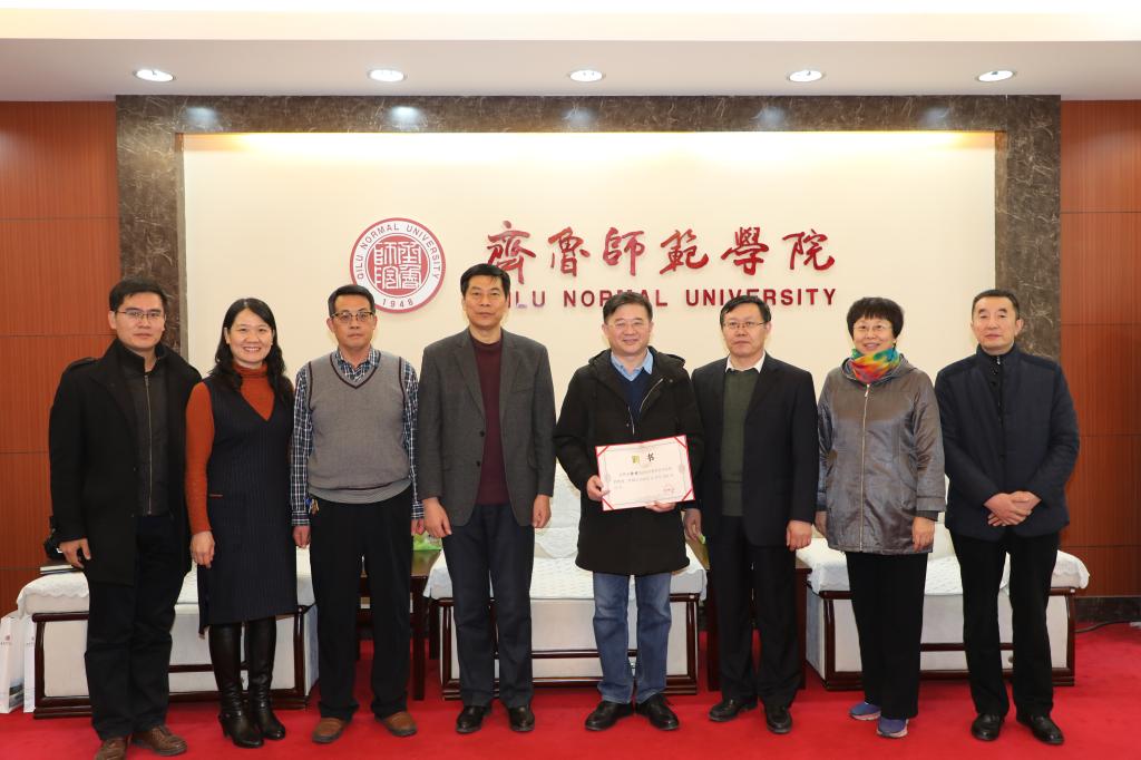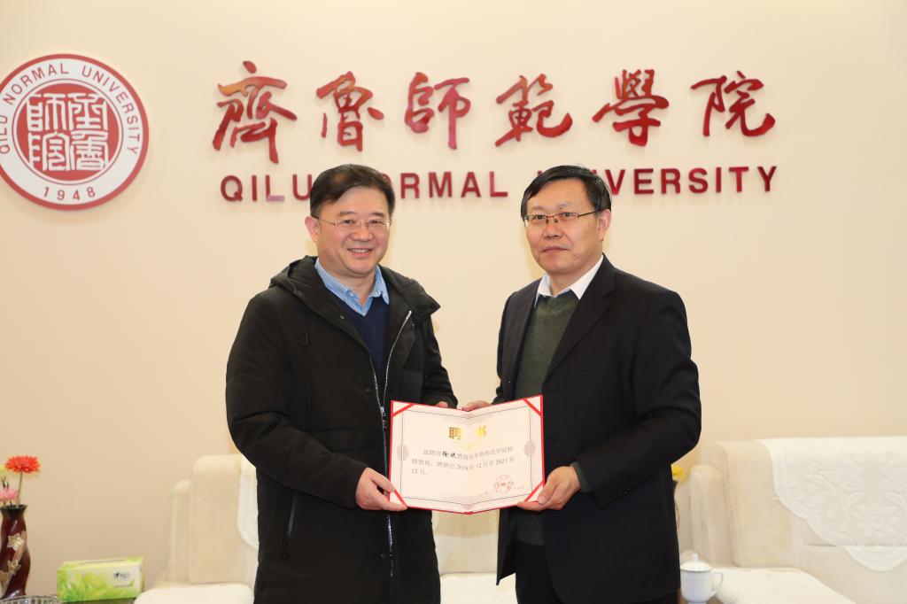 12月27日下午,金年会官网92级政教专业著名校友、北师大马克思主义学院博士生导师、国家社科基金评委徐斌教授受聘仪式暨图书捐赠仪式在章丘校区图书馆一楼接待室举行。党委副书记、校长林松柏教授为徐斌颁发特聘教授聘书,党委委员、副校长张福建教授出席仪式,党委宣传部部长兼教师工作部部长孔嵩峰、马克思主义学院院长刘振光、图书馆馆长官文栎、校友办主任郝克宁等参加仪式。