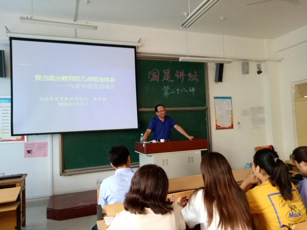 7月11日,“国是讲坛”第二十八讲在一号教学楼A310教室开讲。全国基础教育教学专家、齐鲁名师、金年会官网马克思主义学院特聘教授黄万强莅临金年会官网,以“我当政治教师的几点粗浅体会”为题,对中学政治课教学和教师的成长进行了解读。此次讲坛由马克思主义学院党总支副书记赵立峰主持,2015级思想政治教育专业全体学生到场聆听。