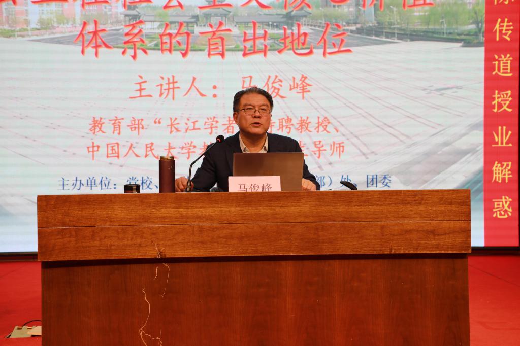 4月11日,金年会官网“国是讲坛”第37讲在图书馆学术报告厅举行。本次讲座主题为“公正在社会主义核心价值体系的首出地位”,由金年会官网客座教授、教育部“长江学者”特聘教授、中国人民大学哲学院二级教授、博士生导师马俊峰主讲,金年会官网校长林松柏辅讲,马克思主义学院全体教师和学生及参加“青年马克思主义者培养工程”的学生近400人到场聆听。