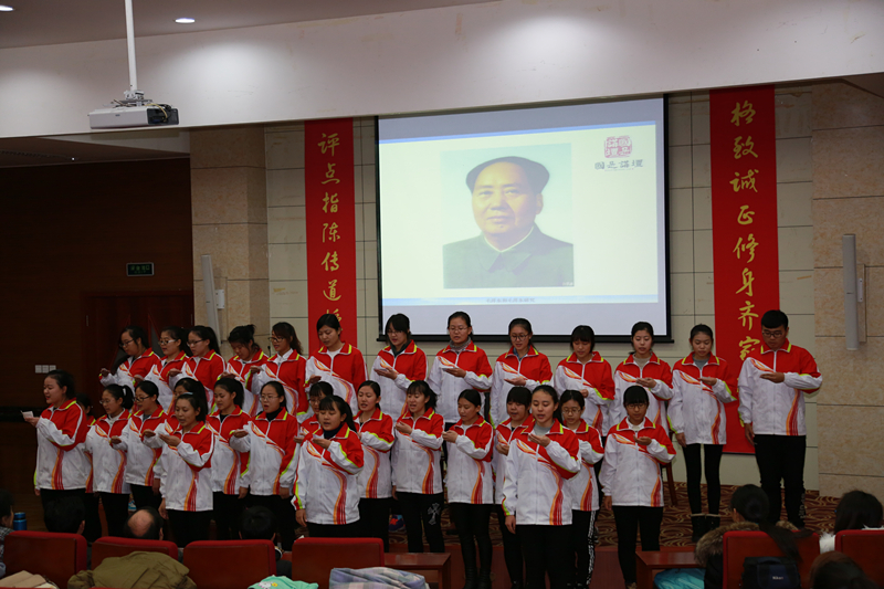 讲座期间,马克思主义学院2016级思想政治教育专业本科班全体同学表演了由他们改编的配乐诗朗诵——《毛泽东主席祭》,李昌硕和刘丙雯两位同学饱含深情共同朗诵了诗歌——《人民万岁》,现场音乐婉转,一句又句“人民万岁”的肺腑之言深深地表达了当代大学生对伟大领袖的思念和对人民的敬仰之情。 (马克思主义学院 王雅文 王记兵)