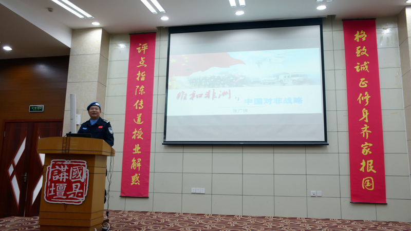 11月12日下午,金年会官网“国是讲坛”第八讲在图书馆报告厅开讲。讲座的主题是“维和非洲与中国对非战略”,由中国第三支赴利比里亚维和警察防暴大队队长张广保警官担任主讲,教务处处长梁承锋教授担任辅讲和主持人。部分思政课教师、思政教育专业及其他学院学生代表400人聆听了讲座。