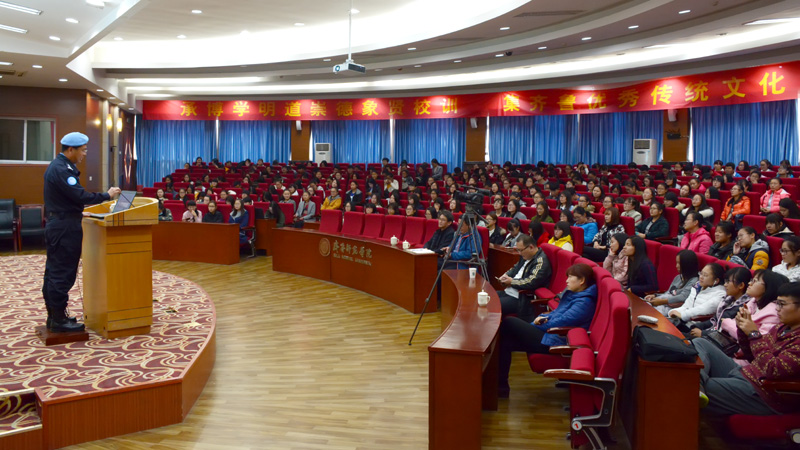 随后,张警官就“维和非洲与中国对非战略”这一主题,结合自己的亲身经历,饱含真情,慷慨陈词,就“中国第三支赴利比里亚维和警察防暴队工作情况” 、“参加维和的工作几点体会”和“关于对我国对非战略的几点理解”等三个方面的问题展开了详尽阐述。张警官在讲坛上所展示的中国维和警察的风采,令与会者钦佩不已。通过此次讲座大家在进一步加深对我国参加联合国维和工作意义的同时,进一步加深了对中国特色社会主义外交和国际战略的理解,深切感悟到改革开放以来我国国际竞争力的增强和国际地位的上升,深切感悟到国家富强、民族独立与人民幸福息息相关。大家一致表示,要立足当前,放眼长远,从小处入手,从点滴入手,健康成长,和谐成才,为早日实现国家富强、民族振兴、人民幸福的中国梦贡献自己的力量。 (马克思主义学院 王雅文 王记兵)