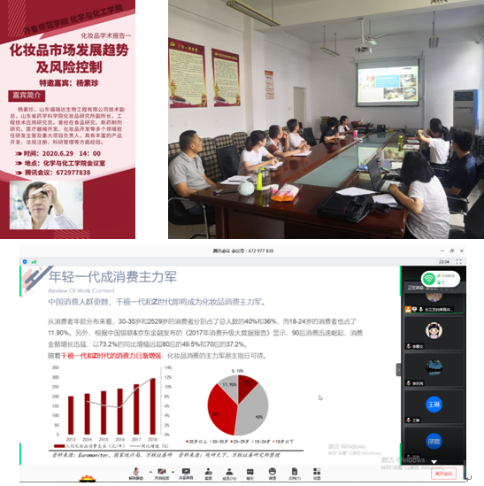 6月29日下午2: 00,化学与化工学院特邀山东福瑞达生物工程有限公司副总经理,金年会官网特聘教授杨素珍开展了题为“化妆品市场发展趋势及风险控制”的学术报告,并通过腾讯会议进行了同步转播。化妆品方向相关教师与18级、19级应用化学专业学生参加了会议,会议由曹晓荣院长主持。