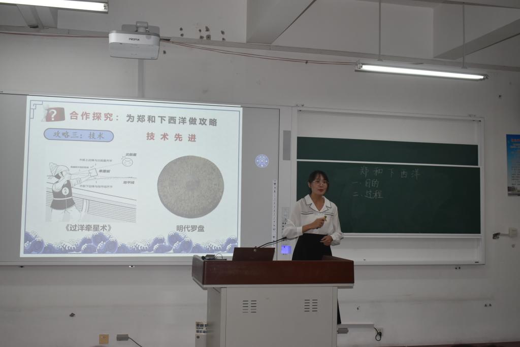 接下来,张劭慧、孙淑琦、郝亚洁三位同学围绕《郑和下西洋》一题进行了展示。初中历史推荐组一等奖张劭慧同学借助富有亲和力的语言讲述郑和下西洋的故事,拉近了同学们与历史的距离,赢得了观摩同学们的好评。初中历史抽取组二等奖孙淑琦同学从研读课标入手,遵循“贴近生活”的理念设计了本课教学,给人耳目一新。初中历史抽取组二等奖郝亚洁同学从细节着手,丰富了学生历史学习资源,展现了良好的素养。