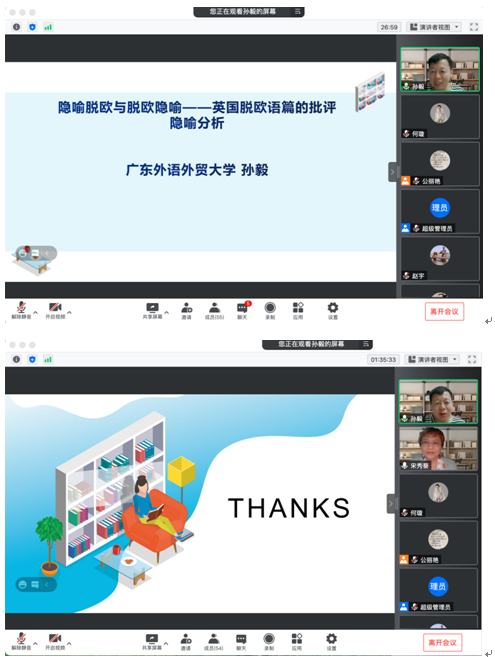 10月27日晚,外国语学院特邀广东外语外贸大学孙毅教授作了题为“隐喻脱欧与脱欧隐喻—英国脱欧语篇的批评隐喻分析”的线上学术讲座。本次讲座由外国语学院院长宋秀葵主持,副院长李百温、学院全体教师共同聆听了此次讲座。