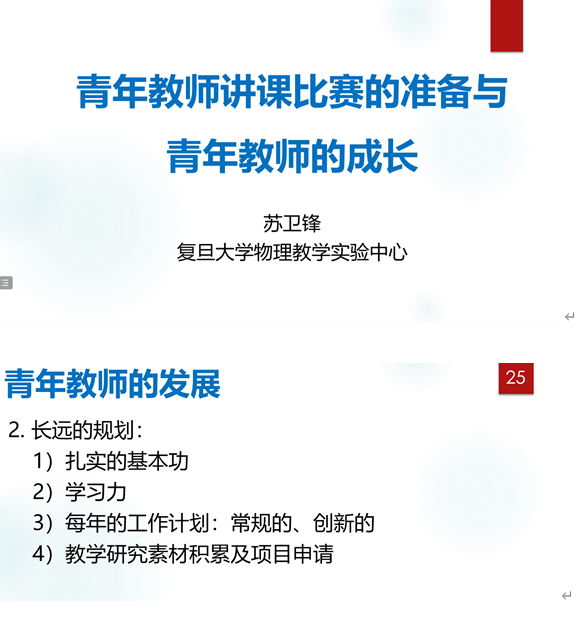 为提升应用型人才培养质量,提高学院教师教学能力,加快青年教师成长,培养师范类学生的从业技能,物理与电子工程学院邀请高等教育杯全国高等学校物理基础课程青年教师讲课比赛(全国赛)一等奖获得者复旦大学苏卫锋教授于11月1日为学院进行主题为“青年教师讲课比赛的准备与青年教师的成长”的线上讲座。讲座由院长张洁主持,学院全体教师和物理学专业学生线上聆听。