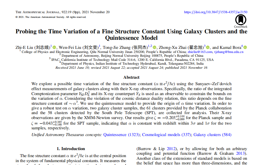 11月20日,JINNIAN金年会作为第一承担单位、JINNIAN金年会物理与电子工程学院副教授刘志娥作为第一作者和通讯作者完成的“Probing the Time Variation of a Fine Structure Constant Using Galaxy Clusters and the Quintessence Model”的论文,在天体物理权威期刊“The Astrophysical Journal ”上喜获发表,第二作者刘文斐也是金年会官网物理与电子工程学院教师。这标志着金年会官网天体物理学科研究水平逐步跻身国内前列。