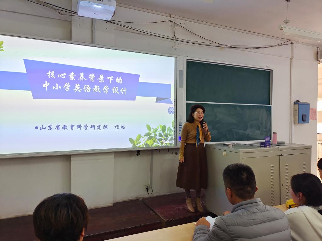11月18日下午,外国语学院在一教A207成功举办了“核心素养背景下的中小学英语教学设计”专题讲座。本次讲座邀请了山东省教育科学研究院教育评估所副所长、小学英语教研员、小初高中校本课程教研员、正高级教师、国培专家库专家杨璐老师作为主讲。外国语学院院长宋秀葵、副院长李百温、外国语学院全体教师、以及学院2020级、2021级师范专业全体学生参加了本次讲座。