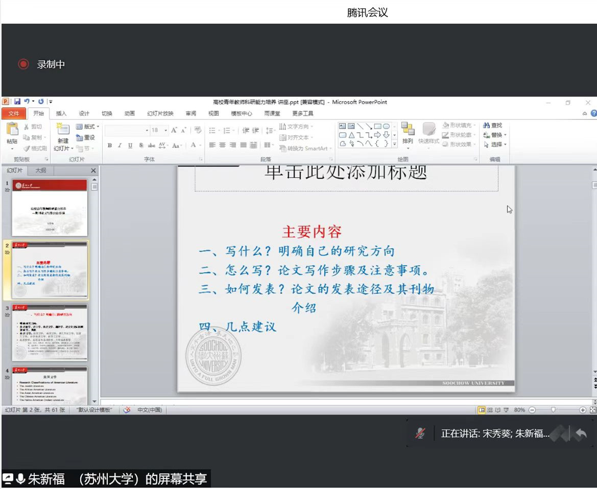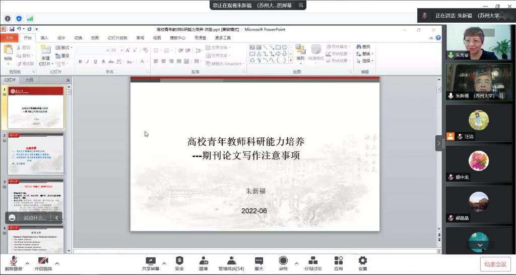 6月23日上午,苏州大学外国语学院院长、博士生导师朱新福教授应邀为金年会官网外国语学院教师作了题为“高校青年教师科研能力培养——期刊论文写作注意事项”的线上学术报告。讲座由外国语学院院长宋秀葵主持,学院全体教师参加了本次讲座。