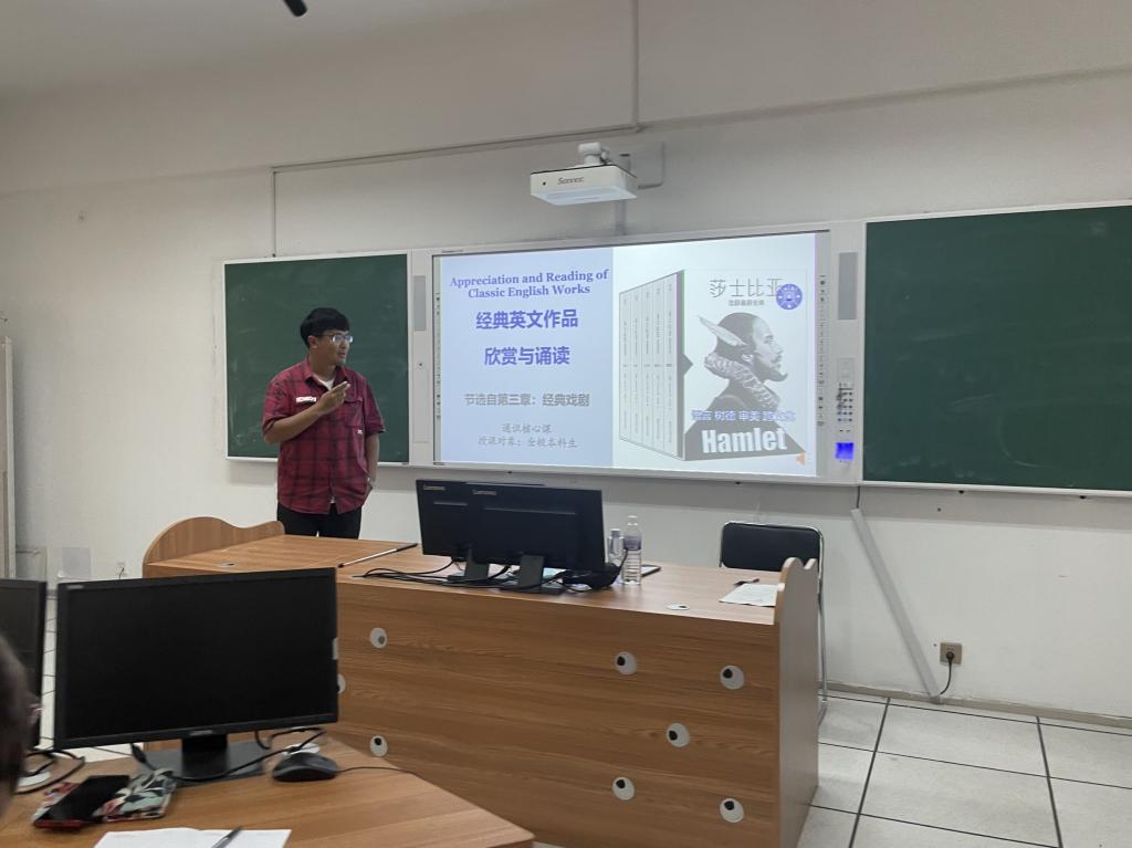 卢攀老师首先以“哈姆雷特独白的欣赏与诵读”为例,完整示范了青教赛的现场授课环节,用逻辑分明、层层递进、内涵丰富的教学方式让老师们体会到了音韵之美、文字之美、文化之美、意境之美。接着,卢攀老师结合自身的参赛经验,从参赛课程及内容选择依据、参赛课程设计思路与亮点、教学成果与成效的展现三个方面进行了细致的讲解。