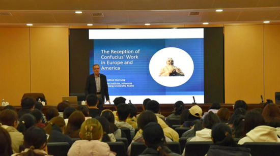 报告会上,霍农教授以17世纪至19世纪在欧美国家翻译并出版的孔子著作为例,指出孔子的思想丰富了欧洲思想家的知识,并产生了一种跨文化解释学的形式,对人的道德行为具有很重要的影响。霍农教授的报告生动形象、内涵丰富,并热情地与师生们互动交流,为更好地弘扬中华优秀传统文化、培育践行君子人格开拓了国际视野。