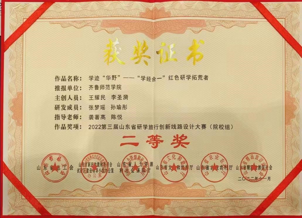 3月16日,第三届山东省研学旅行线路设计大赛颁奖仪式在山东大厦顺利举行。由教师教育学院学生王耀民、李圣漪作为主创人员,张梦瑶、孙瑜彤作为研发成员,袭著高、陈悦联合指导的作品《学迹“华野”——“学经合一”红色研学拓荒者》在全省600多份比赛作品较量中取得佳绩,斩获2022第三届山东省研学旅行创新线路设计大赛(院校组)二等奖。这是教师教育学院从教师参与获奖到师生共同参与获奖的一次转变。