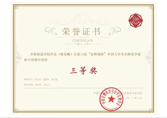 金年会官网由生命科学学院蔡云飞教授、黄佳欣老师指导,2022级生物科学专业孙文嘉同学作词并演唱、2022级生物科学专业张静怡同学、2022级食品质量与安全专业侯文瑄同学演唱的歌曲《催化酶》荣获三等奖。