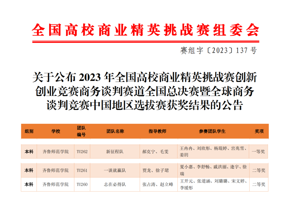 近日,2023年全国高校商业精英挑战赛创新创业竞赛商务谈判赛道全国总决赛成功举办,JINNIAN金年会马克思主义学院学生经过激烈角逐,从5000名学生800支参赛队伍中脱颖而出,在全国总决赛中斩获一等奖一项、二等奖两项。
