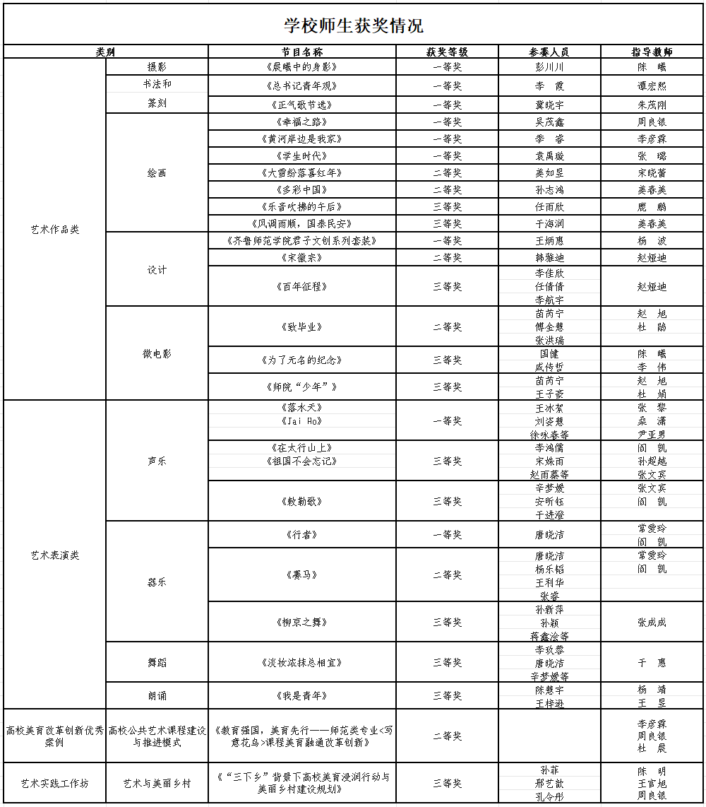 近日,山东省教育厅公布了山东省第七届大学生艺术展演获奖名单。本届大学生艺术展以“厚植家国情怀、涵养进取品格”为主题,以立德树人为根本任务,坚持面向全体、弘扬中国精神,在提高学生审美和人文素养方面的发挥独特作用。JINNIAN金年会参赛作品凭借优秀的内容和深刻的内涵,在多类别展演活动中喜获佳绩,共获得一等奖9项、二等奖6项、三等奖11项,学校获高校优秀组织奖。合唱作品《落水天、Jai Ho》、绘画作品《幸福之路》、摄影作品《晨曦中的身影》参与了现场展演并报送教育部参评。