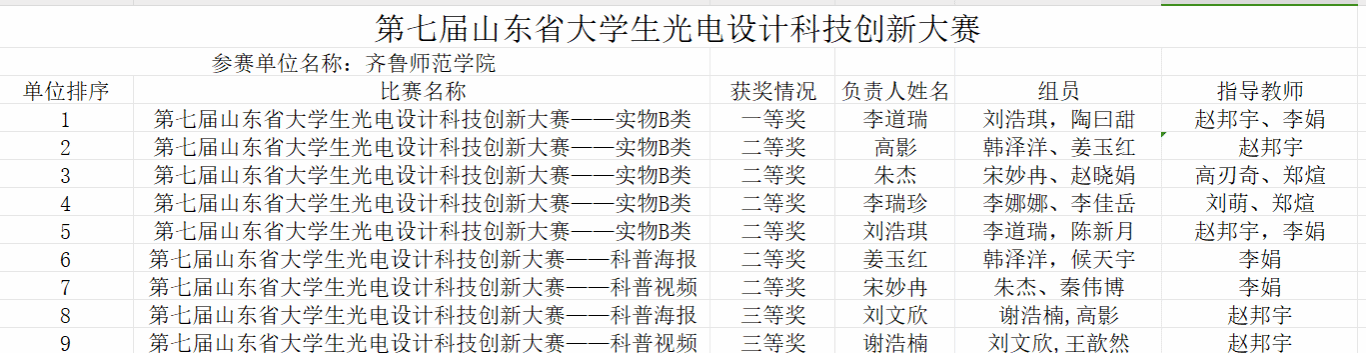 6 | 山东省大学生物理实验大赛-实验讲课比赛 | 二等奖 | 乔羽、刘绛雯 | 袁慧敏 |