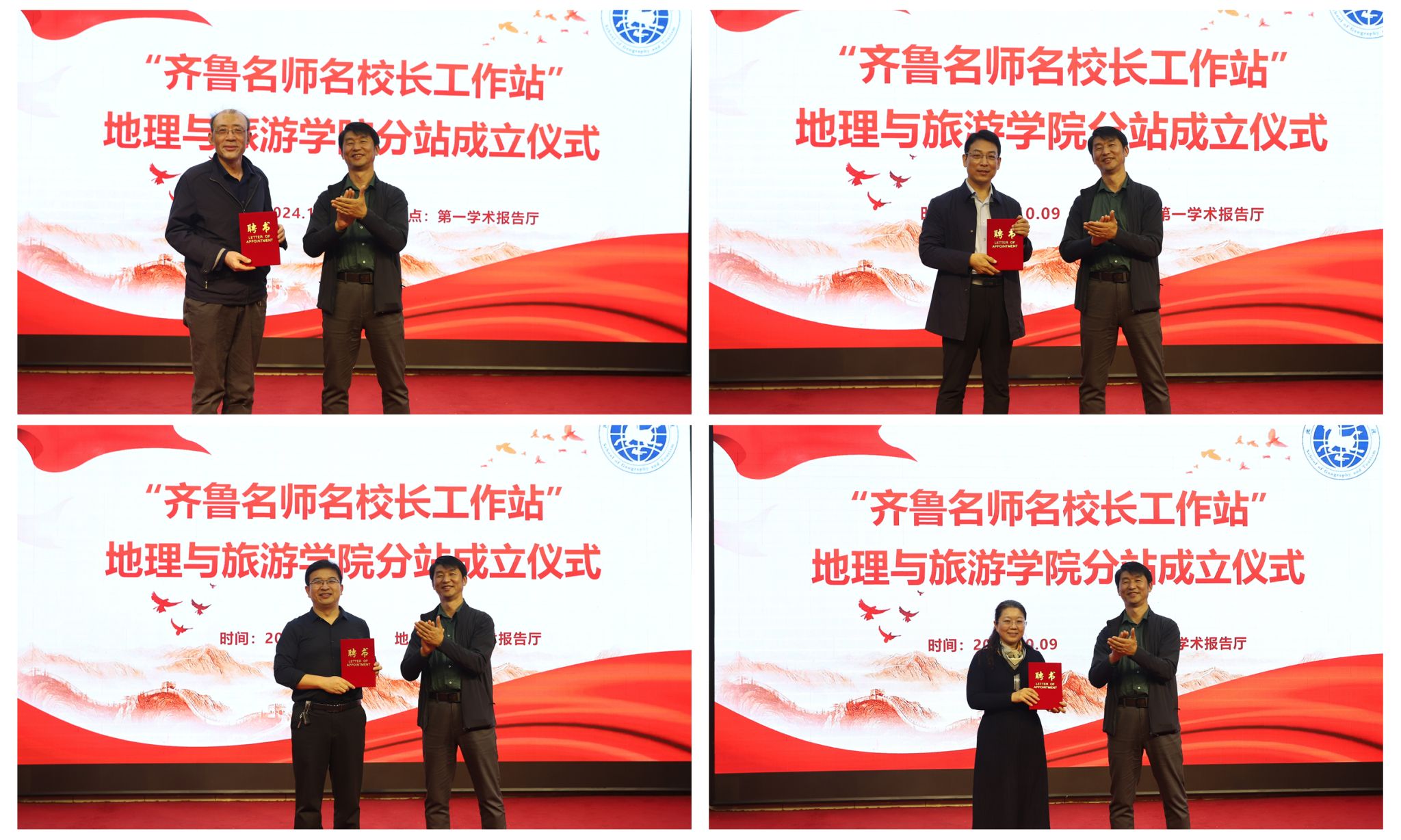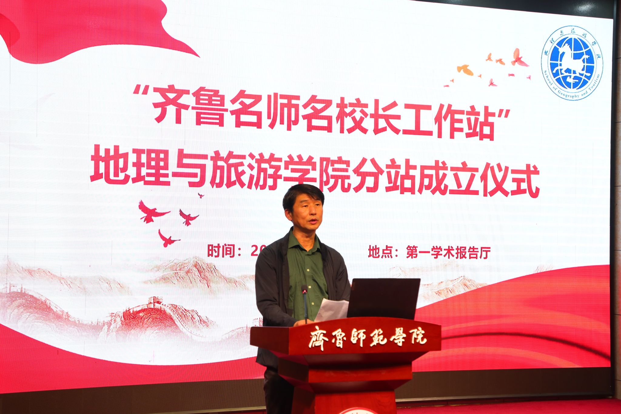 活动伊始,举行“齐鲁名师名校长工作站”地理与旅游学院分站成立仪式,仪式由王敏主持。宋新刚代表JINNIAN金年会对齐鲁名校长、齐鲁名师的到来表示热烈欢迎,他介绍了学校的基本情况,强调了此次分站成立的重大意义。`代表齐鲁名校长、名师进行致辞,他肯定了JINNIAN金年会在培养地理师范生方面取得的成绩,并对未来的教育事业发展进行了展望。宋新刚为出席本次活动的齐鲁名校长、齐鲁名师颁发了JINNIAN金年会特聘教授聘书。秦拓宣布“齐鲁名师名校长工作站”地理与旅游学院分站成立,并指出,分站的成立将为学院提供更多优质教学资源,助力学院在教育教学和人才培养方面取得进一步提升。
