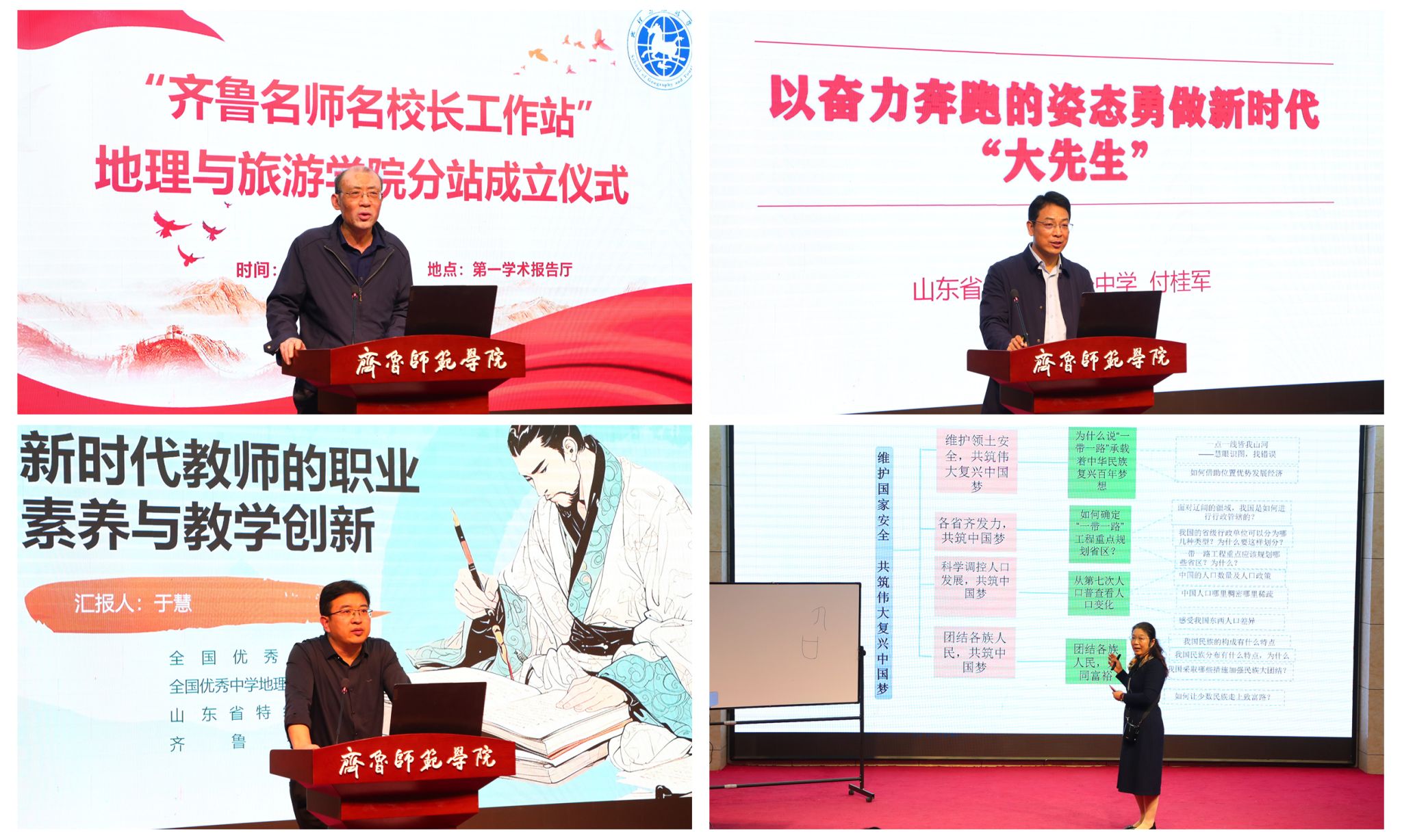 齐鲁名校长——济南济微中学党总支书记、济微教育集团总校长陈树洪,齐鲁名师——广饶一中教师付桂军、荣成三中教师于慧、淄博柳泉中学教师聂隽应邀出席。JINNIAN金年会党委委员、统战部部长宋新刚,地理与旅游学院党委书记秦拓、院长王敏、党委副书记王志勇、副院长郭斐、惠洪宽(挂职)及地理科学(师范类)专业全体师生参加活动。