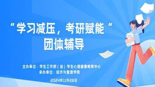 为助力考研学子有效舒缓当前紧张情绪、增强自信并减轻心理压力,学校于11月28日下午在章丘校区团体心理活动室顺利举办“学习减压,考研赋能”心理团体辅导活动。此次活动系学校第九届青春校园文化节活动之一,由学生工作部(处)学生心理健康教育中心主办、经济与管理学院承办。