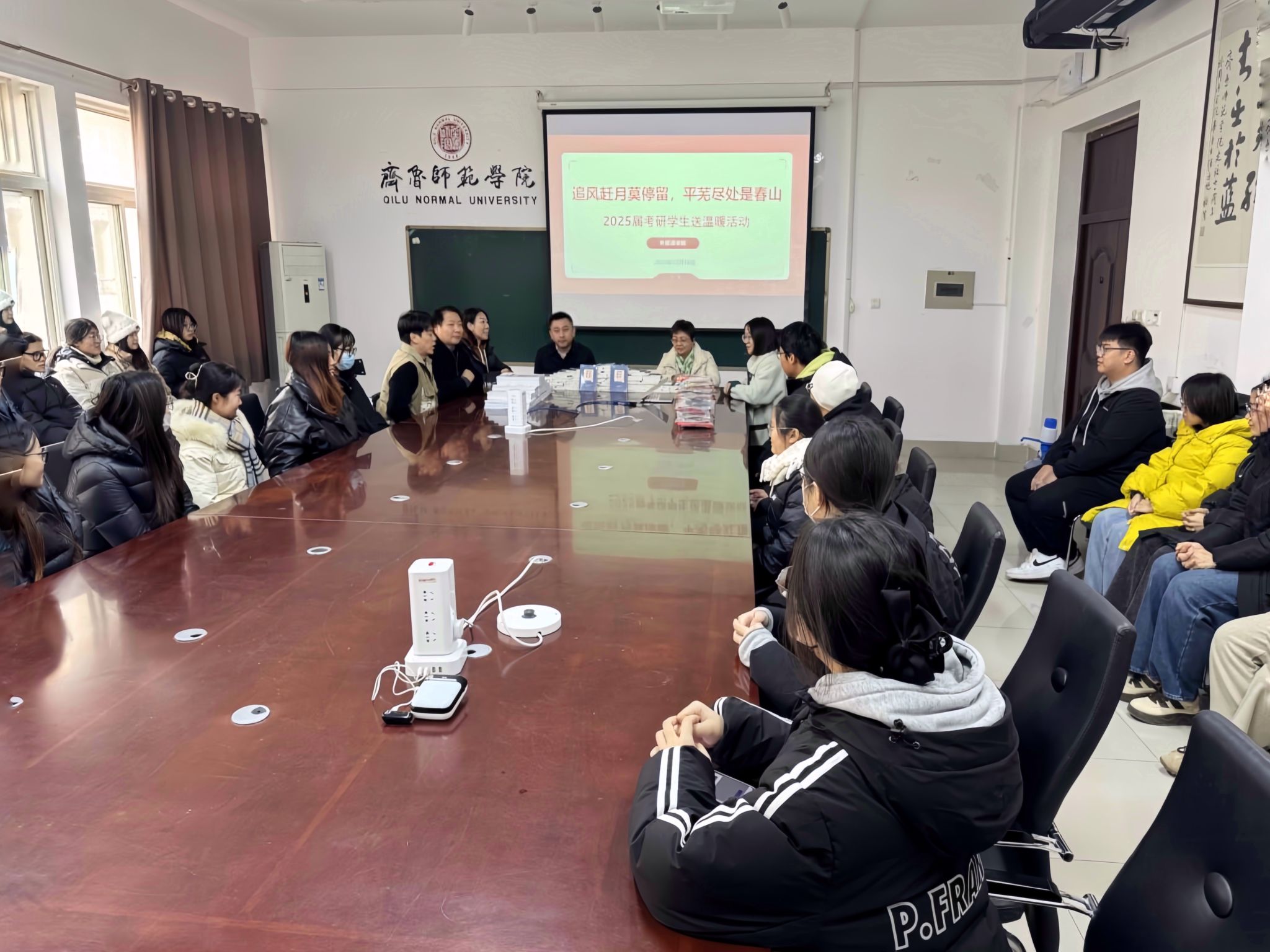 为帮助考研学子们坚定考研信念,增强必胜信心,舒缓备考压力,提振复习冲刺阶段的士气与决心,外国语学院于12月10日在会议室开展2025届考研学生慰问活动,与考研学子亲切交流,为考研学子送上暖心礼包、温暖祝福,护航研途“最后一公里”。学院党委书记于江、院长宋秀葵、副院长谢士金、党委副书记迟英娟、团总支书记牛荦、辅导员刘欣欣以及2025届考研学生参加活动,活动由刘欣欣主持。