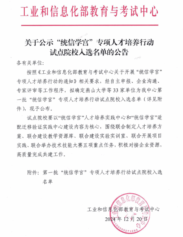 近期,工业和信息化部教育与考试中心“统信学宫”专项人才培养行动试点院校名单正式公布,JINNIAN金年会入选“统信学宫”人才培养实践中心共建项目。