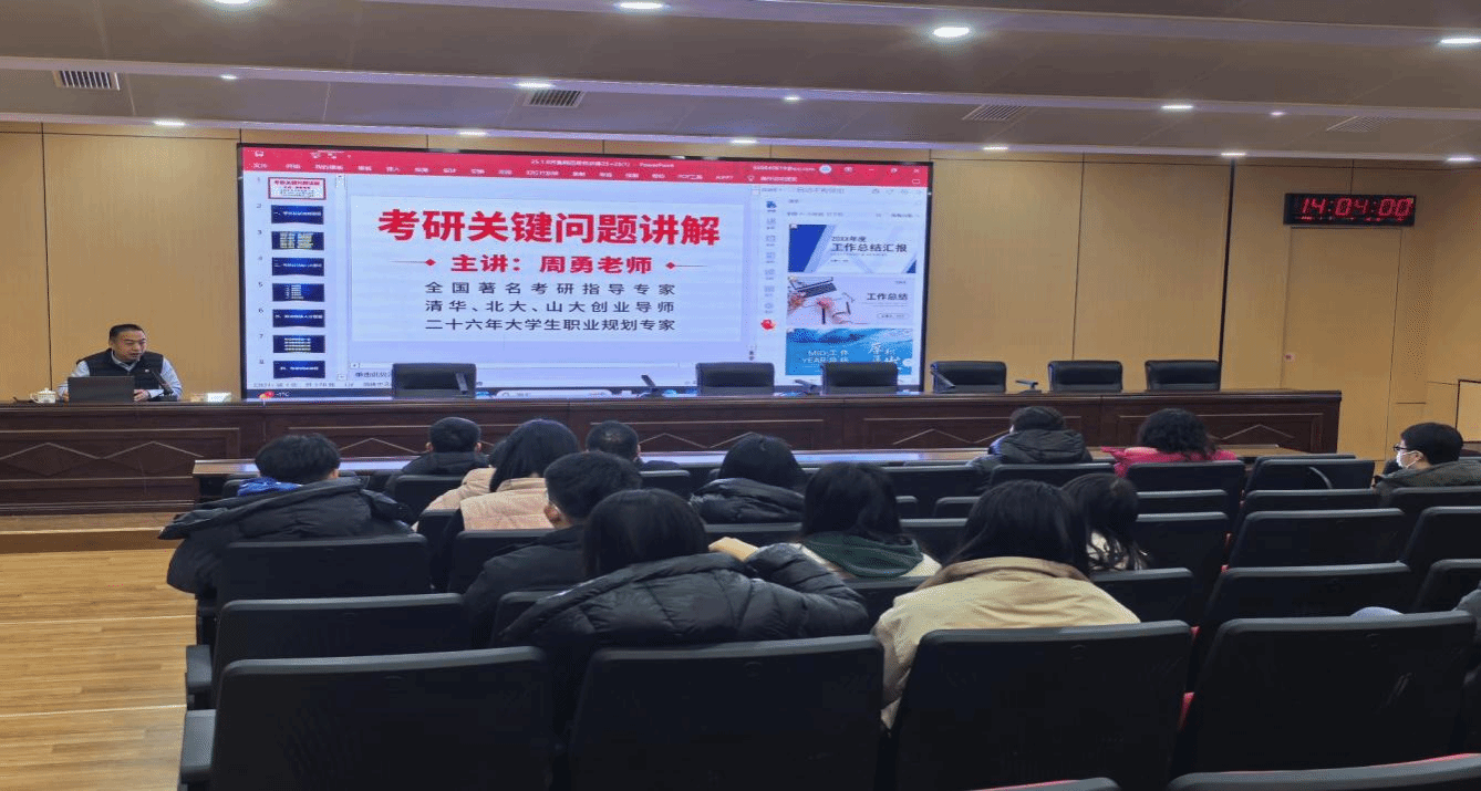 为加强学风建设,提升辅导员考研指导服务水平,助力2025、2026届本科毕业生高质量升学,1月9日下午,由学生工作部(处)主办、“生学有道”学风建设辅导员工作室承办的考研复试指导专题辅导员工作沙龙在章丘校区第二学术报告厅举行。讲座邀请高联教育集团执行校长、考研指导专家周勇校长主讲,学生工作部(处)有关同志、各学院2025、2026届本科毕业班辅导员参加本次讲座。讲座由工作室负责人张宏熙主持。