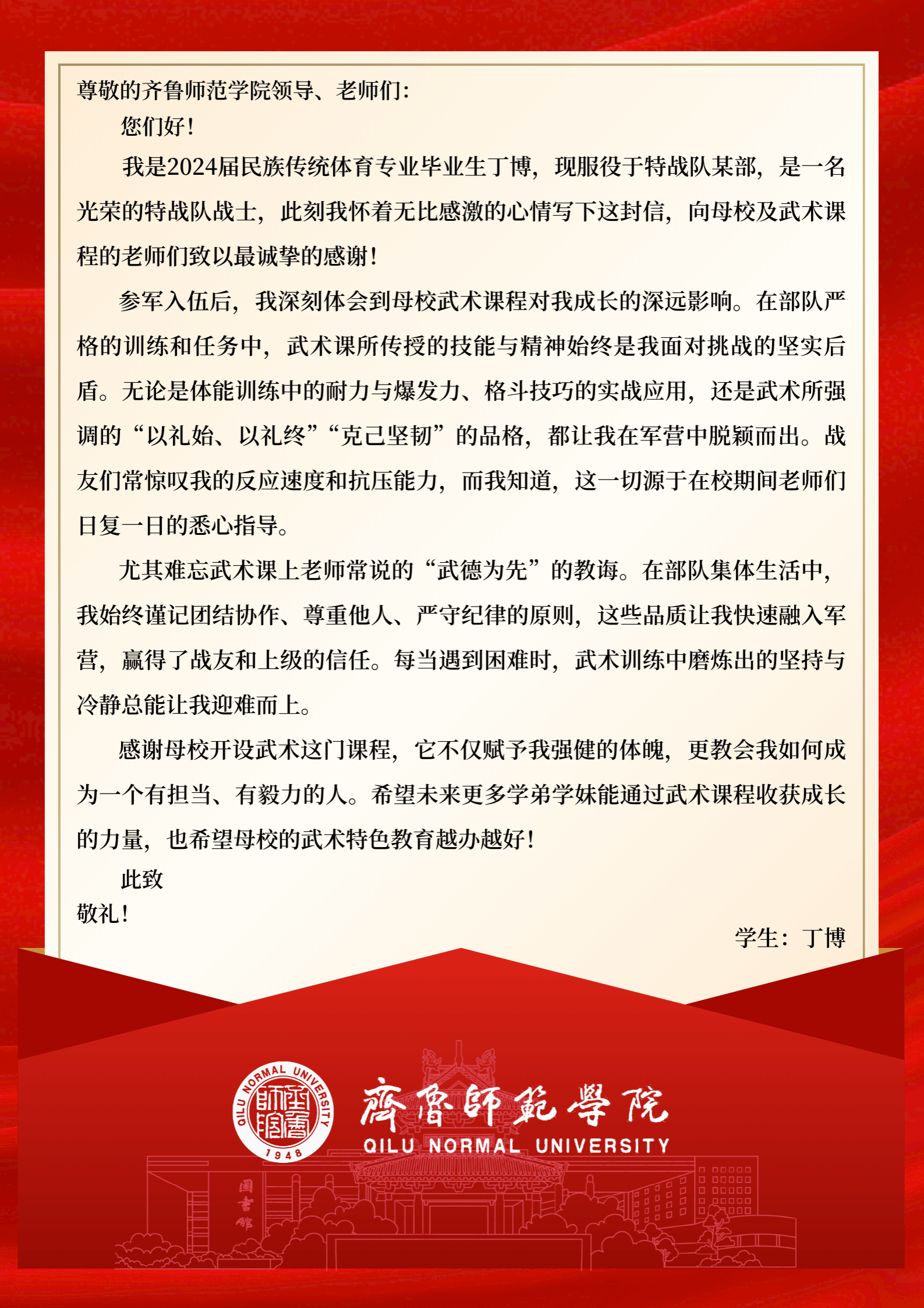 2月15日,一封特殊的感谢信寄到学校。来信人是学校2021级民族传统体育专业学生丁博,现服役于中国人民解放军特战某部。他在信中深切感谢学校的培养,并着重对在校期间所受的武术教育表示感谢。