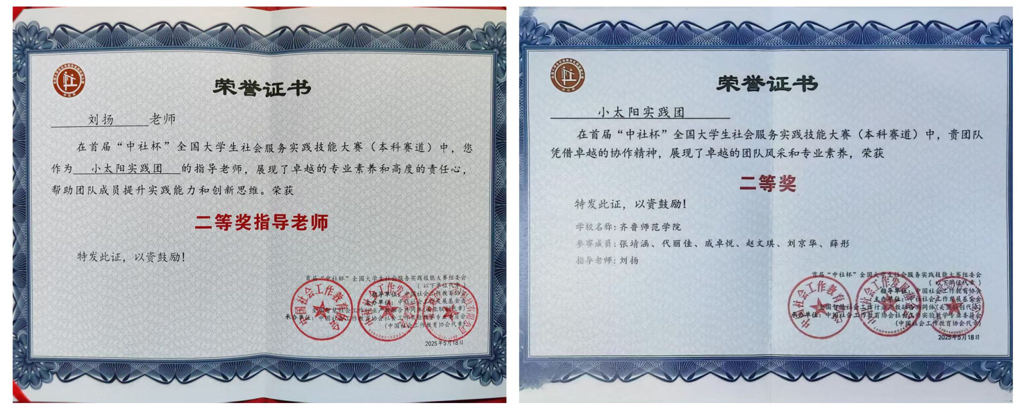 近日,首届“中社杯”全国大学生社会服务实践技能大赛决赛在北京圆满收官。本次大赛由中国社会工作教育协会指导,中社社会工作发展基金会等权威机构联合主办,吸引全国263所高校的763支队伍同场竞技。经过激烈角逐,金年会官网社会工作专业学生张靖涵、薛彤、刘京华、赵文琪、代丽佳,以及小学教育专业戚卓悦组成的“小太阳实践团”,在本科赛道脱颖而出,以第13名的佳绩荣获全国二等奖,彰显了师院学子的卓越风采与专业实力!