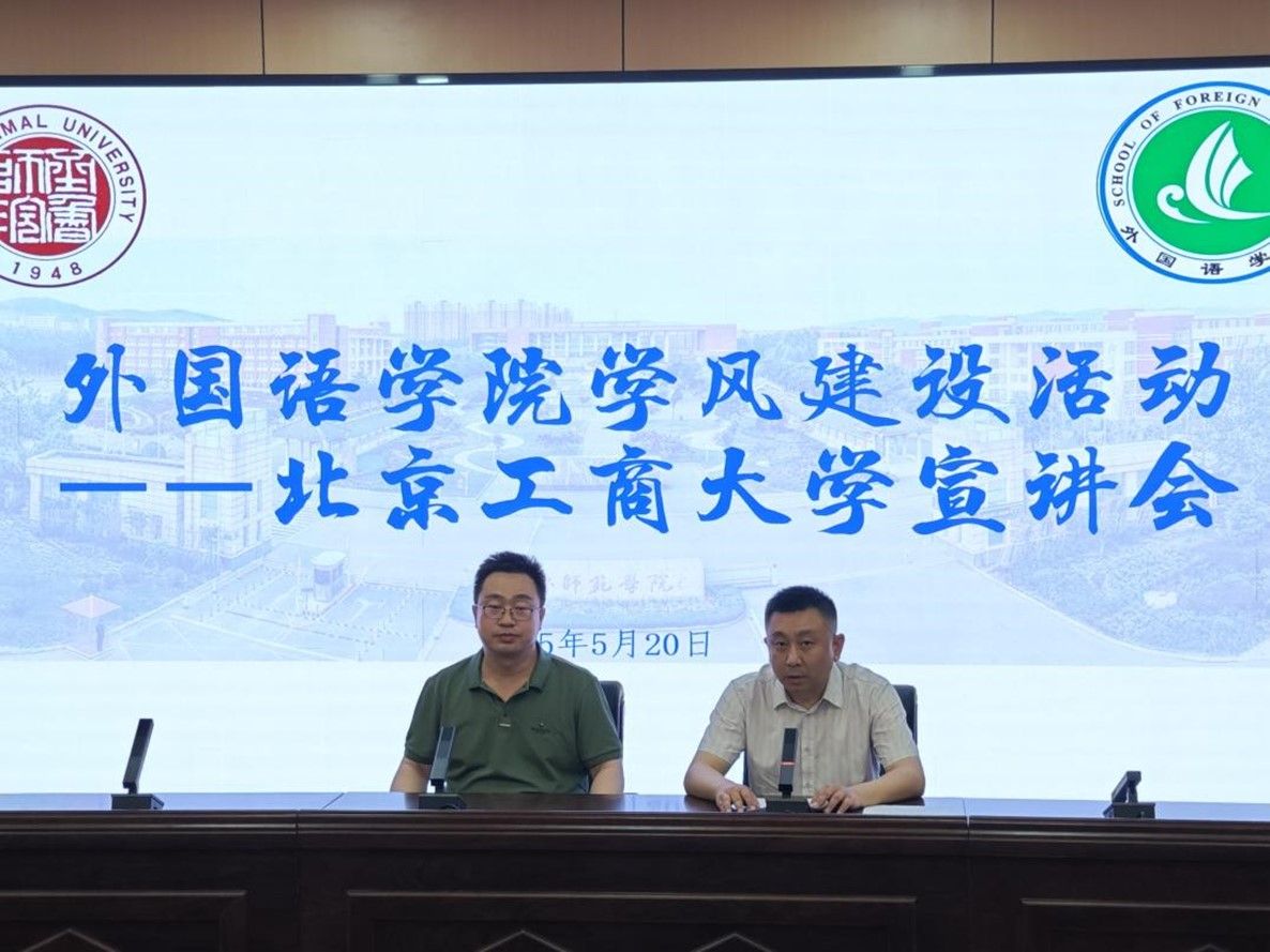 为进一步提升考研指导服务质量,助力学生明晰招生动态、科学规划学业发展路径,5月20日,外国语学院在2教A111举办北京工商大学语言与传播学院硕士研究生招生宣讲会。北京工商大学语言与传播学院副院长史岩林、商务英语系教师田莉、国际法商英语专业在读研究生张冬雪;外国语学院党委书记于江、党委副书记迟英娟、商务英语教研室主任石磊,以及学院部分学生共同参与此次活动。