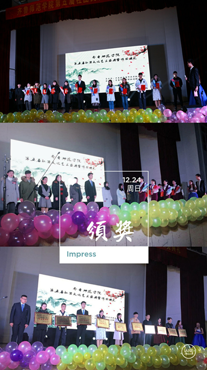 颁奖典礼在由墨林书法协会带来的《倚梦燃青,一苇前行》的精彩开场节目中拉开帷幕,颁奖典礼中汇集了歌曲、舞蹈、话剧、小品等多种表演形式,内涵丰富,精彩纷呈。颁奖典礼现场授予了爱心社、BGD舞团和纵横辩论协会“五星社团”荣誉称号;纵横辩论社、嘻哈公园、惠心手工坊等11个社团“四星社团”荣誉称号;此外,经社团推荐,组织考察,决定授予黄秀清、李剑、崔勇等10位老师“社团优秀指导教师”荣誉称号;赵宝丽、王雅文、刘萍等10位老师“社团优秀工作者”荣誉称号;厉子涵、高玉涵、温建豪等10位同学“社团十佳风云人物”荣誉称号;蔡晓东、张星、王奕晨等10位同学“社团优秀社长”荣誉称号。