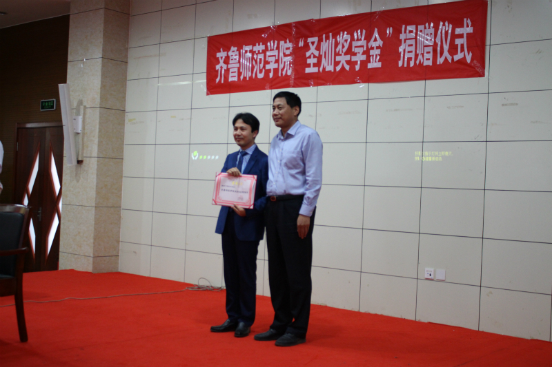 捐赠仪式上,张殿臣副书记向邹圣灿董事长颁发了“优秀校友”证书,张福建副校长从邹圣灿董事长手中接受了所赠与的奖学金。