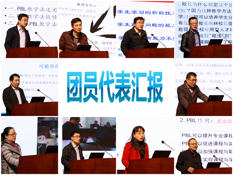 随后,研修团教师代表依次作了汇报发言。根据此次赴台研修的切身感受和心得体会,大家分别从范式比较的视角、结合自己的教学改革尝试,作了题为:《问题导向式学习的理念、实践与思考》(朱振华)、《PBL模式对器乐技能课程的思考》(崔玉涛)、《PBL的概念、尝试与反思》(焦培福)、《台湾地区“教学创新”经验与课程转化机制》(孙洪兆)、《不虚此行,砥砺前行》(刘萌)等的汇报,研修团员谢士金、张克玉、王玉华、刘芳、郭思亮等教师立足自身的研修心得,先后向与会领导、老师们分享了自己下一步围绕“问题导向式行动学习”向能力范式转变的目标、计划和措施。