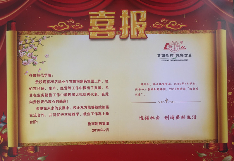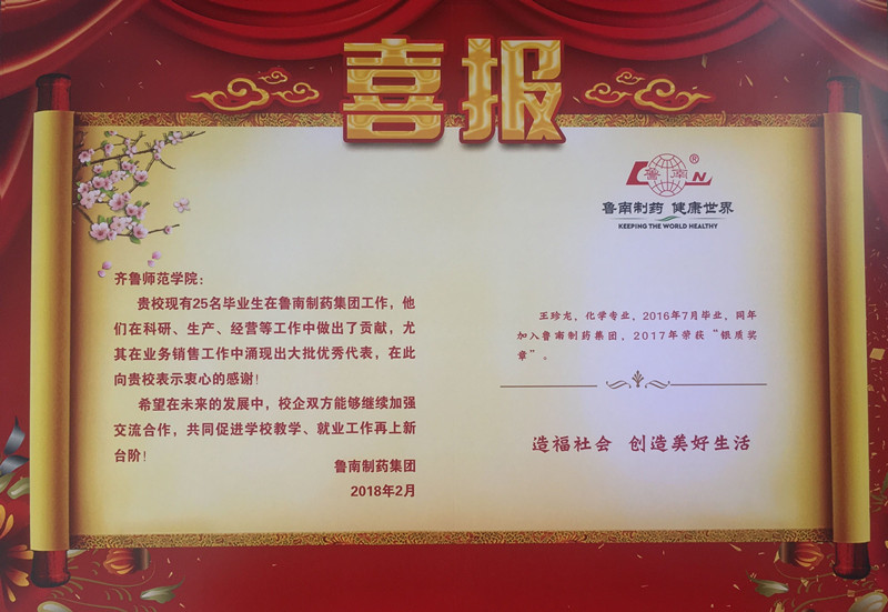 3月15日,鲁南制药集团股份有限公司为金年会官网送来喜报,金年会官网体育学院毕业生潘洪刚荣获2017年“双金质奖章”,化学与化工学院毕业生王珍龙、经济与管理学院毕业生郝以武均荣获2017年“银质奖章”与“行动奖章”。