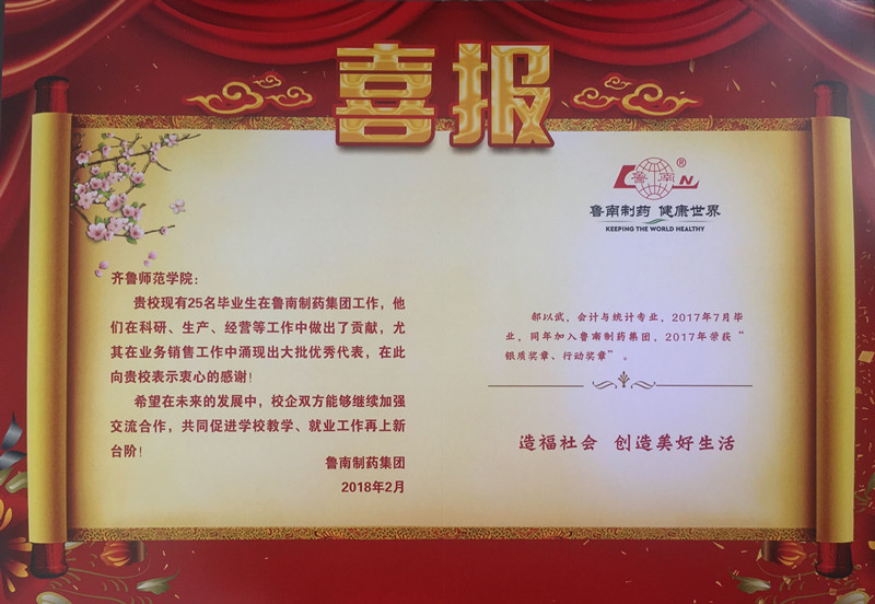 鲁南制药集团是集中药、化学药品、生物制品的生产、科研、销售于一体的综合制药集团,国家创新型企业、国家火炬计划重点高新技术企业。现有金年会官网市场营销、化学、旅游管理、美术教育、计算机应用等多个专业的18名本专科毕业生在鲁南制药集团工作,负责集团在北京、河北、江苏、黑龙江、上海、福建等多个销售区域,多人多次荣获“金质奖章”、“银质奖章”、“行动奖章”、“翻番功勋勋章”等荣誉,得到了集团的高度认可与嘉奖。